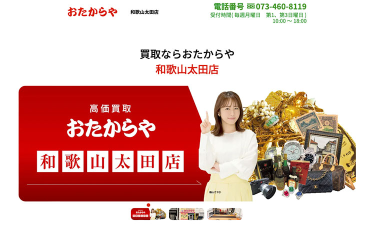 | 特徴 | おたからやは全国に1,000以上の店舗を持つ、業界最多を誇る買取店です。取り扱っている買取項目も尋常ではない多さです。なお、和歌山県内には和歌山太田店を入れて10店舗があります。 |